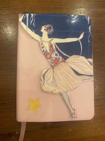 Her song-writing process expands beyond her friends, though: the most important part is a cute notebook. She pulls out a pink and blue book with a ballerina on the cover, reaching towards the far edges of the leather. “My mum bought me this notebook,” she says, turning it over in her hands, “Then I decorated it, so now it’s like, “Okay, it’s mine.” It’s an important space to me. It’s also not just songs or lyrics.” She flips through to a recent page, and I catch glimpses of her gently looping script as she shows me notes from a lecture where she forgot her iPad.